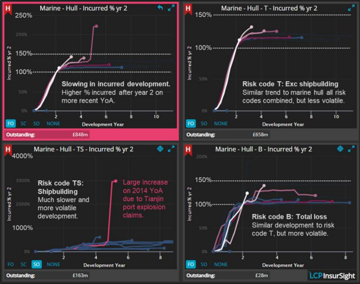 We then drill down into Marine Hull by risk code to better understand the drivers of the trends seen in the incurred development.