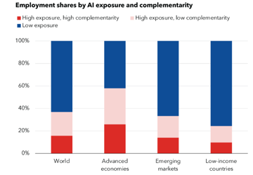 AI will re-shape labour markets and displace jobs, which has long term implications for social cohesion. The UN has warned that AI could impact 40% of jobs worldwide, and could exacerbate global inequality over the coming decade, through reducing the competitive advantage of low-cost labour in developing countries. Analysis by the International Monetary Fund (IMF) also supports this claim, as shown in the chart below.