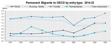 The chart illustrates uptrends in permanent types of immigration over 2014-23 to the OECD.