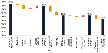 The results show the aggregate Solvency Capital Requirement (SCR) ratio falling from 185% pre-stress to 154% after all elements of the core scenario have played out, a drop of 31%. This is a material reduction in the capital coverage, reflecting the severity of the stress, but the aggregate post-stress position is well above the regulatory minimum of 100% giving policyholders comfort that the sector is well capitalised. The most material impacts in the stress test related to credit downgrades, credit spreads, interest rates and property prices.