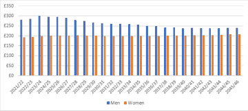 As the chart shows, male pensions at retirement are currently substantially more than female pensions, and that gap will grow slightly in the next few years. But after this, male pensions will fall sharply relative to earnings. Women’s pensions grow slightly, mainly because of improvements in state pensions.