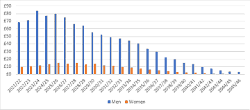 Chart 2 highlights the extent to which it has historically been men who have dominated income from private sector salary-related pensions (whereas in the public sector there are more women than men building up salary-related pensions). However, this means that as private sector salary-related pensions die out, it is male pensions which slump as a result.