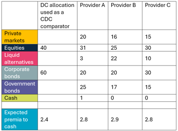 Below we provide a breakdown of the highest returning DC strategy we see commonly shown as a comparator to CDC (the 40/60 portfolio) and compare it to three mainstream DC Master Trust strategies. You will see the at-retirement allocation to both be a simplistic representation, but also again underplaying the return potential newer DC strategies are expecting.