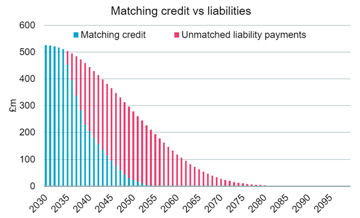 - Use credit assets to match shorter-dated liabilities, where both asset and liability cash flows are more certain. Match less at longer horizons but allow flexibility to buy long-dated matching assets when risk/return assessments are more attractive. The chart below illustrates my thinking: the blue distributions from matching credit are expected to cover all of the benefit payments required on a 5 year horizon, but I’m using much less “matching” for longer dated liabilities, unless compelling assets are available.