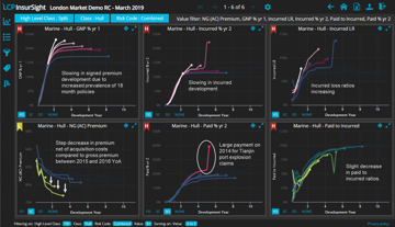 An example of this approach using LCP InsurSight is shown below. We start with a summary dashboard showing 6 key diagnostics for the Marine Hull reserving class.