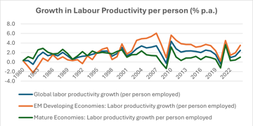 I present charts below that highlight each of the three GDP growth components. The largest contributor to EM growth in recent decades has been labour productivity growth, but sadly it has been on a downtrend. It has been adversely affected by the pandemic through its inimical effects on informal EM labour markets. I believe that the post-Covid recovery in EM labour markets is incomplete. Informal labour markets are typically not conditioned to recover from global shocks like a pandemic but policy responses have not addressed this and have been slow in stimulating the labour markets.