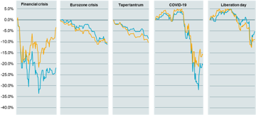 Source: Bloomberg. Global equities is the FTSE All World Series All World Total Return Index. Periods shown for each set of bars are: Financial crisis (30/09/2008 – 31/12/2008), Eurozone crisis (15/03/2012 – 04/06/2012), Taper tantrum (22/05/2013 – 24/06/2013), COVID-19 (01/01/2020 – 31/03/2020) and Liberation day (1/01/2025 – 15/04/2025). Results are based on a Sterling investor.