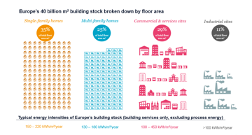 Although C&I buildings make up only about 40% of Europe’s total floor space, their energy intensity is 40–50% more per m2 than residential buildings. Put differently, each square metre of C&I space represents a larger energy opportunity. And that figure reflects only building services — lighting, heating, cooling, and appliances. On top of that sits the far larger category of industrial process loads from furnaces and motors to industrial boilers, which dwarf building service demand in many sectors.