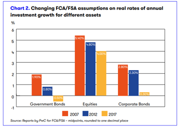 Based on these figures, Table 1 shows a weighted average real rate of return for a simple portfolio comprising 60% equities, 20% corporate bonds and 20% government bonds based on the reports published in 2007, 2012 and 2017 – a fall from 4.2% in 2007 to 2.4% in 2017.