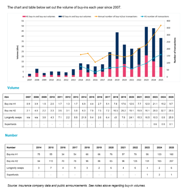 - Buy-in volumes for 2025 at £38.2bn fell short of the levels achieved in 2023 and 2024 when volumes approached £50bn (2023: £49.1bn, 2024: £47.8bn) but demonstrate a continued trend of elevated volumes compared to historical levels (see chart at end). The market continues to operate at “cruising altitude”, as we described in our 2024 report on the market.