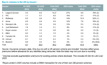 - Strong insurer competition was a particular feature of 2025, intensifying over H2 as insurers strove to meet ambitious new business targets after a relatively muted H1 (H1 2025: £9.7bn, H1 2020-2024 (5-year average): £13.7bn). H2 2025 volumes were the second highest on record at £28.5bn (H2 2024: £32.7bn). Strong competition drove both exceptional buy-in pricing levels and innovation in non-price areas such as improved online functionality to support an enhanced member experience post buy-out.